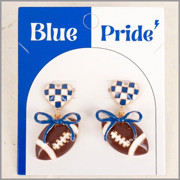 Blue and White Color Coated Heart with Bow & Football Gameday Stud 1.5" Earring