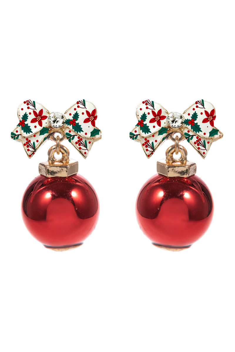 Christmas Bow with Red Ornament 1.25" Earring