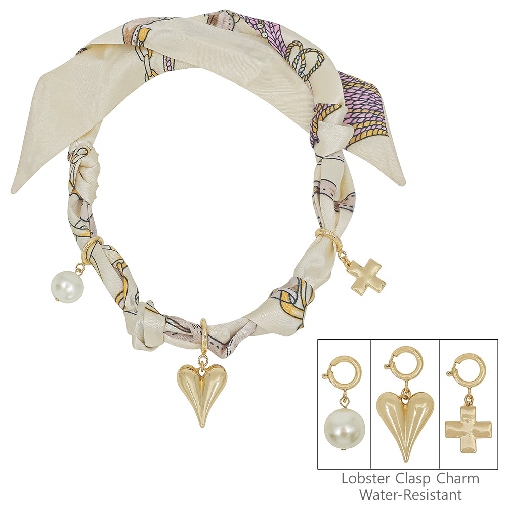 Cream/Natural Knotted Scarf Necklace with Puffy Heart,Open Cross, and Bow Charm, VERY POPULAR!