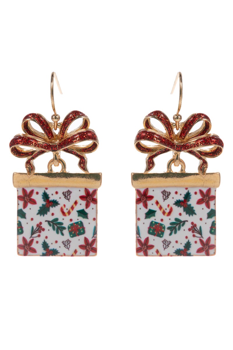Multi Red/Green/White Color Coated Metal Present Christmas 1.5" Earring
