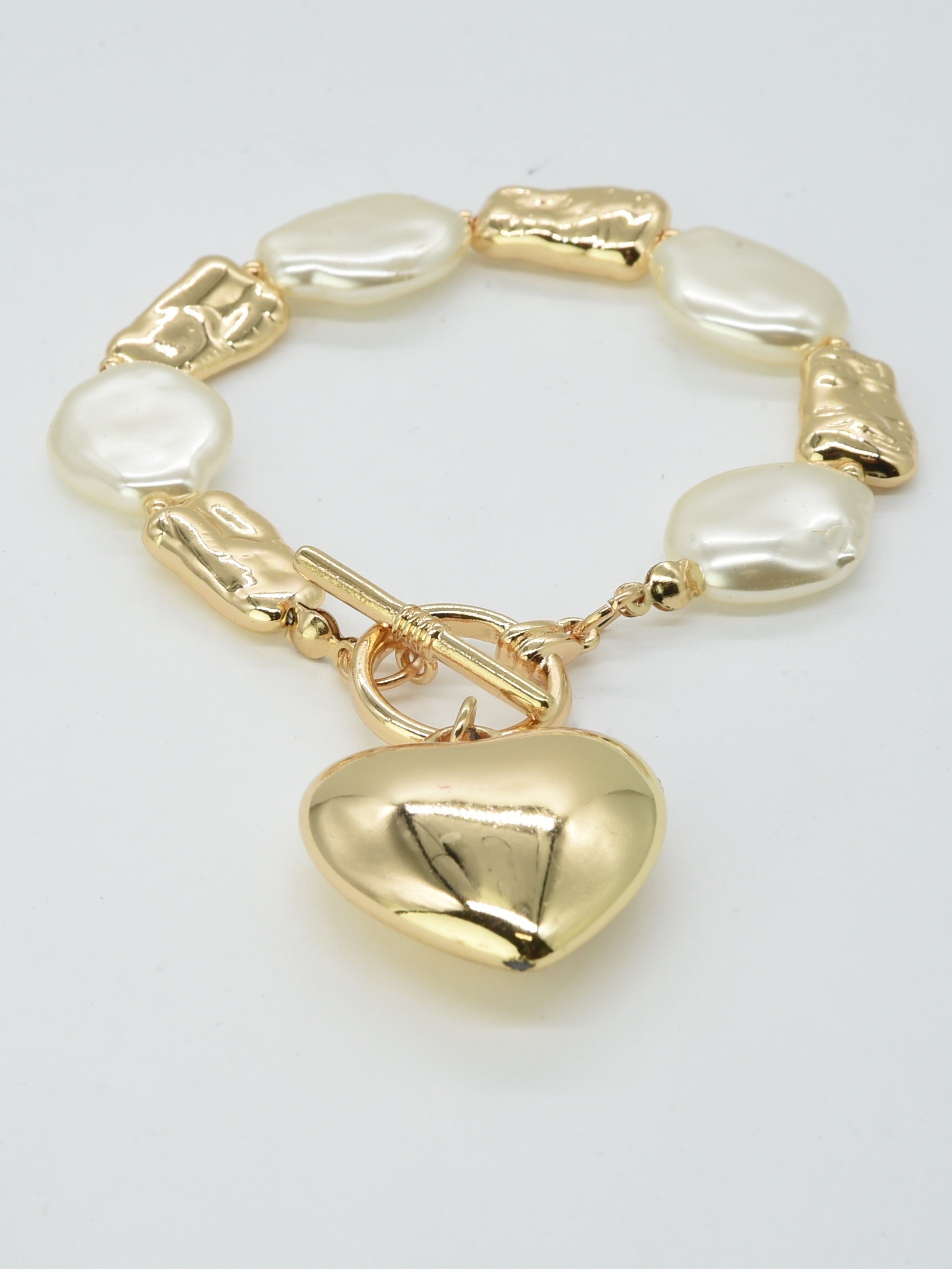 Flat Oval Pearl and Textured Gold Toggle Bracelet with Puffy Heart Charm