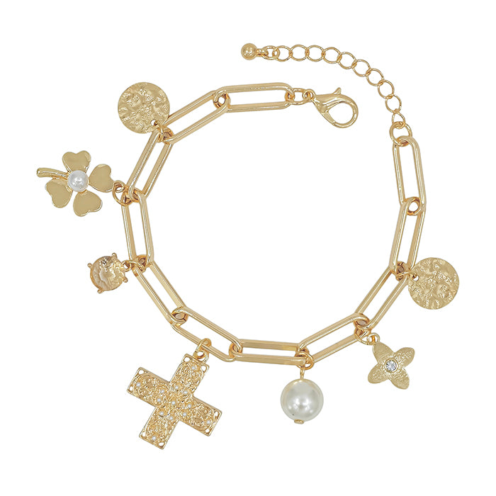 Gold Chain Bracelet with Cross and Coin Charm 7" with Extender