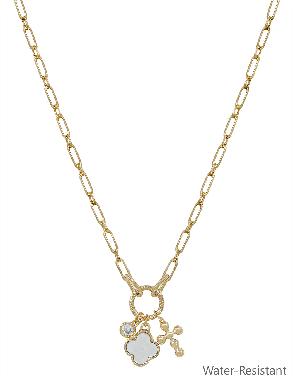 Gold Chain with Clover, Crystal, Cross Charms 16"-18" Necklace