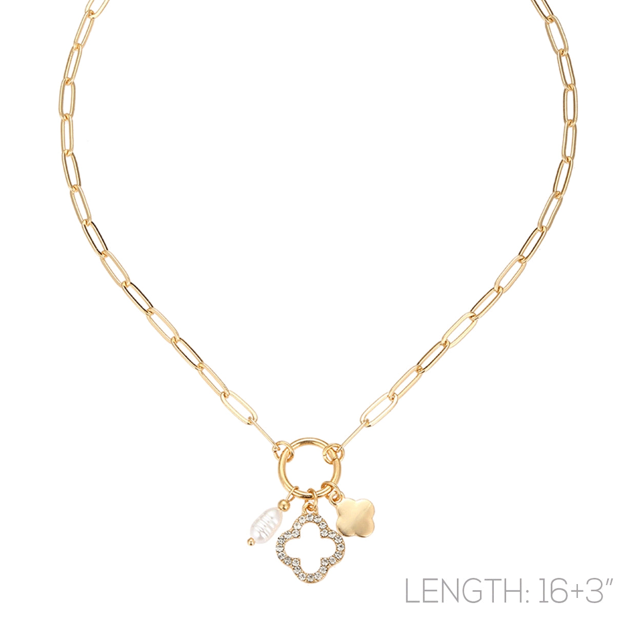 Gold Chain with Open Clover and Pearl Charm 16"-18" Necklace