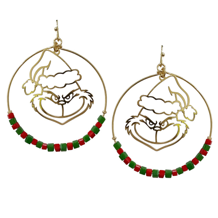 Gold Grinch Cutout with Multi Beaded Accent Open Circle 2" Earring