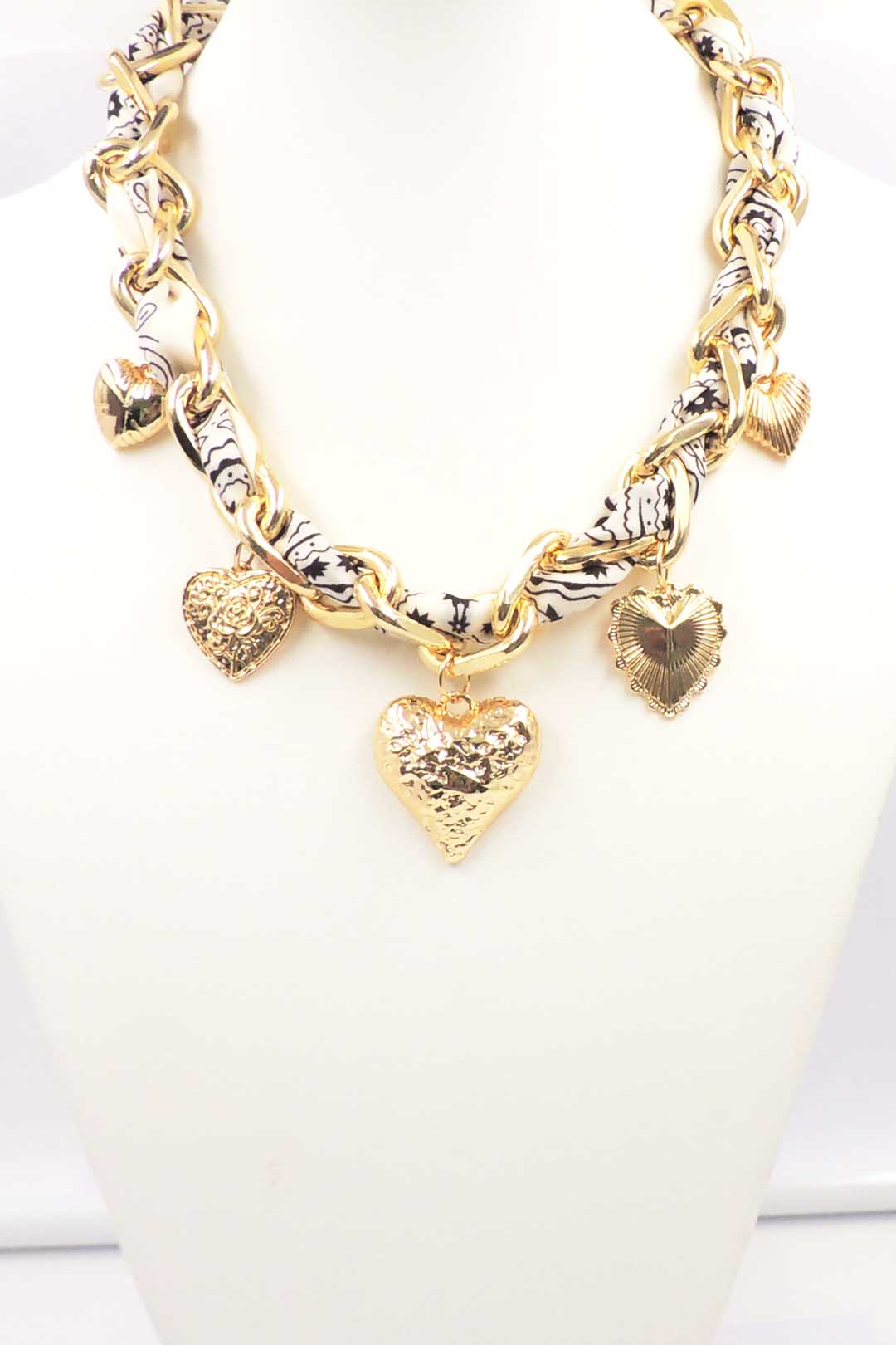 Gold Link Chain with White and Black Scarf Wrapped Charm Necklace