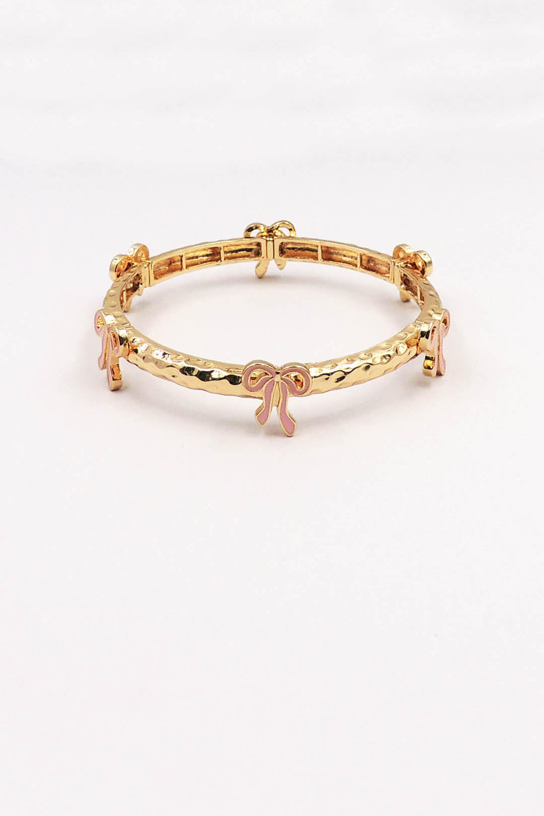 Gold Metal Hammered Stretch Bracelet with Pink Bows