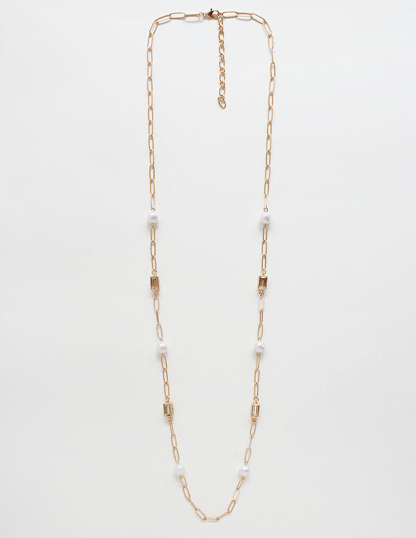 Gold Textured Chain with Clear Crystal and Pearl 32" Necklace