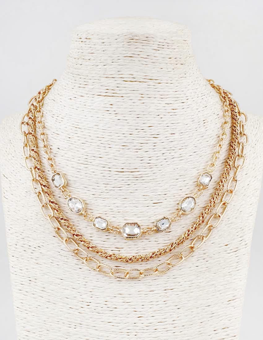 Gold Textured Layered Chain with Clear Crystal 16"-18" Necklace