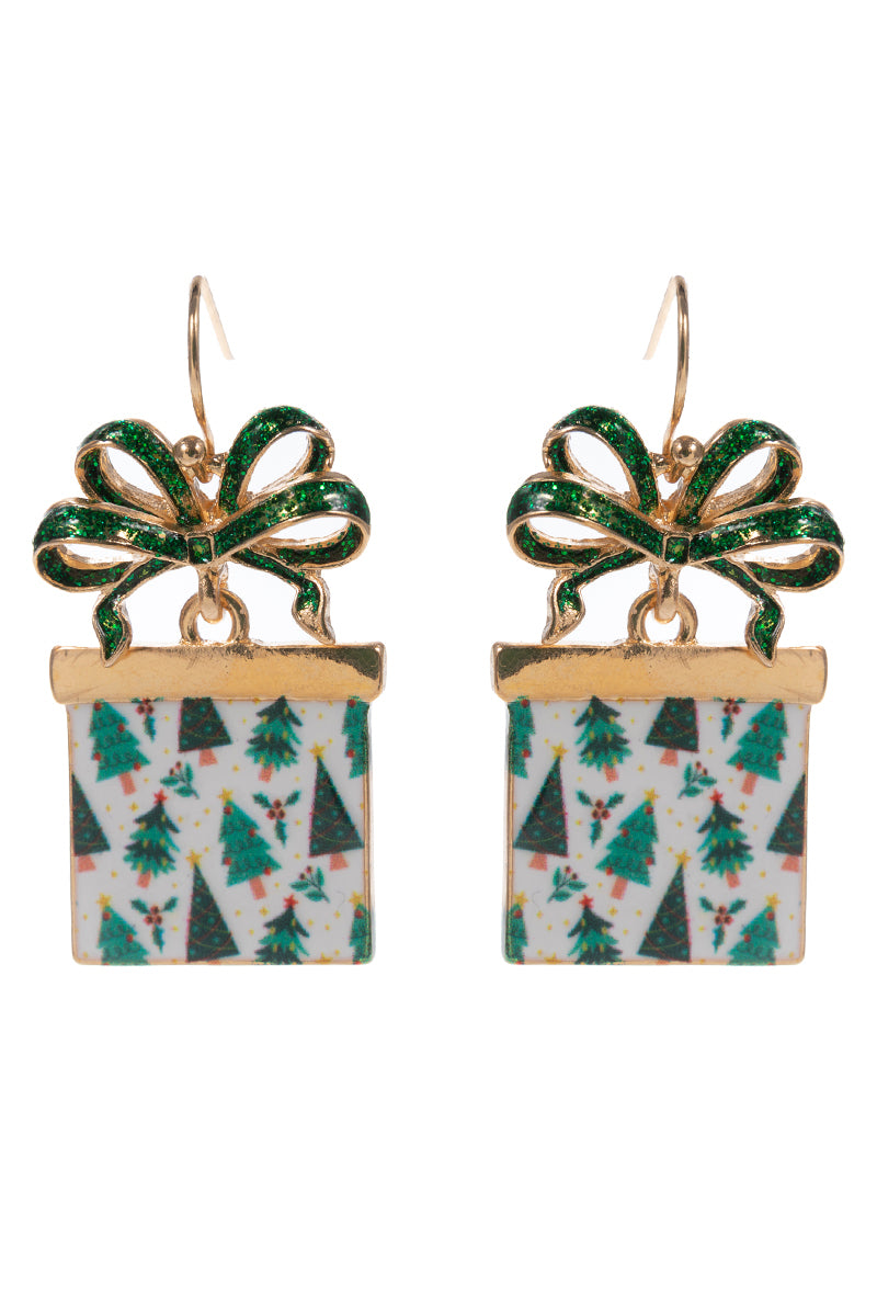 Green/White Color Coated Metal Present Christmas 1.5" Earring