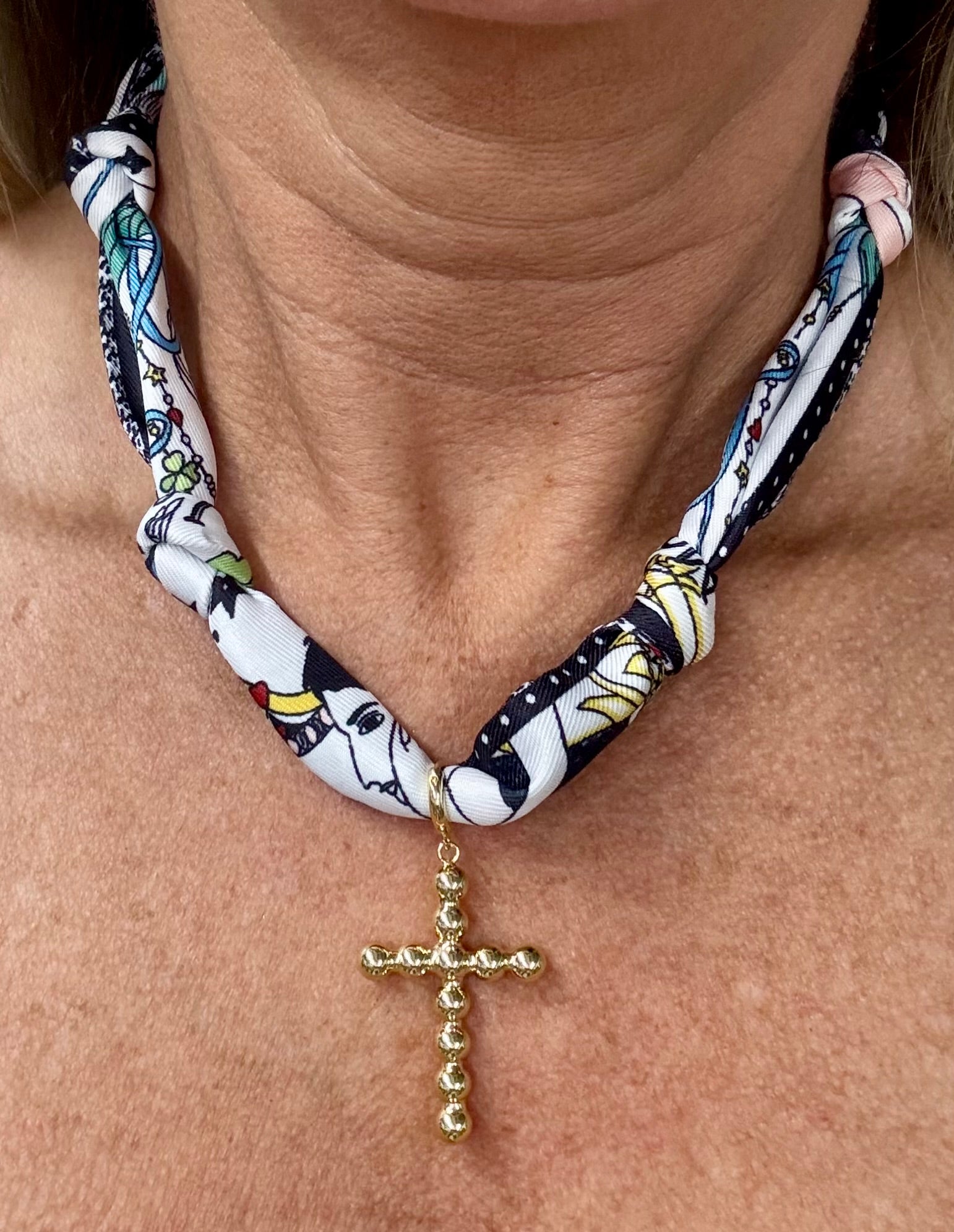 Navy and White Knotted Scarf with Bubble Cross Removable Charm