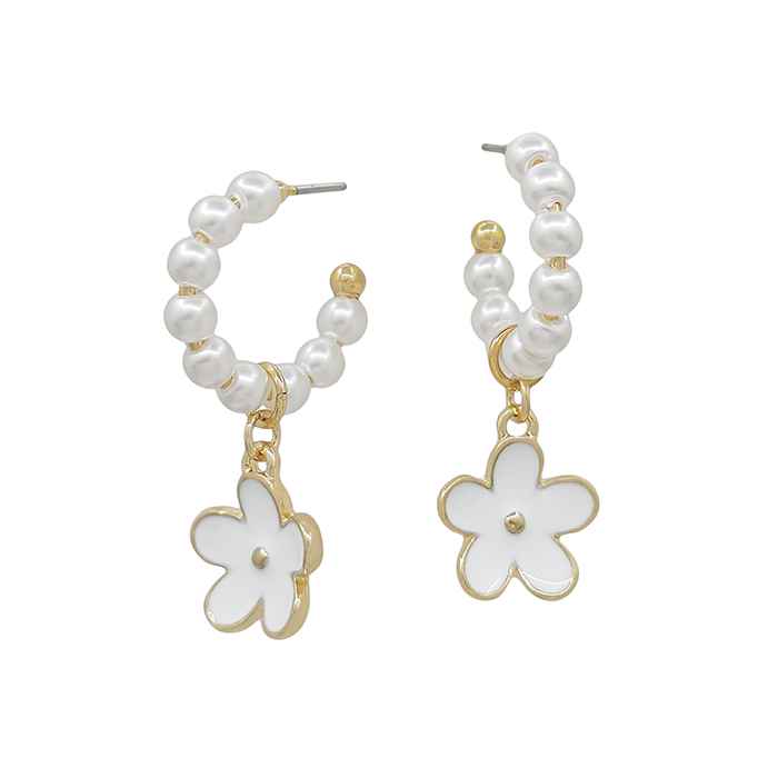 Pearl .75" Hoop Earring with White Enamel Flower Drop