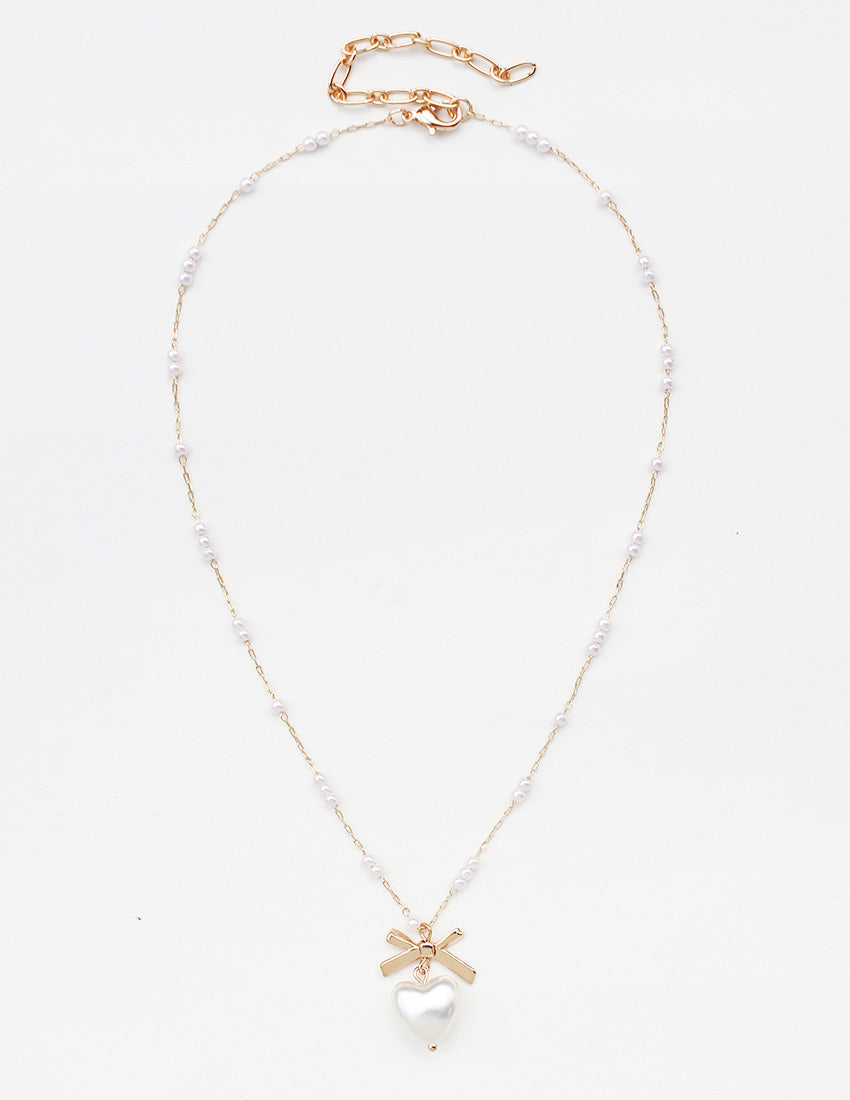 Pearl Beaded Chain with Bow and Pearl Heart 16"-18" Necklace