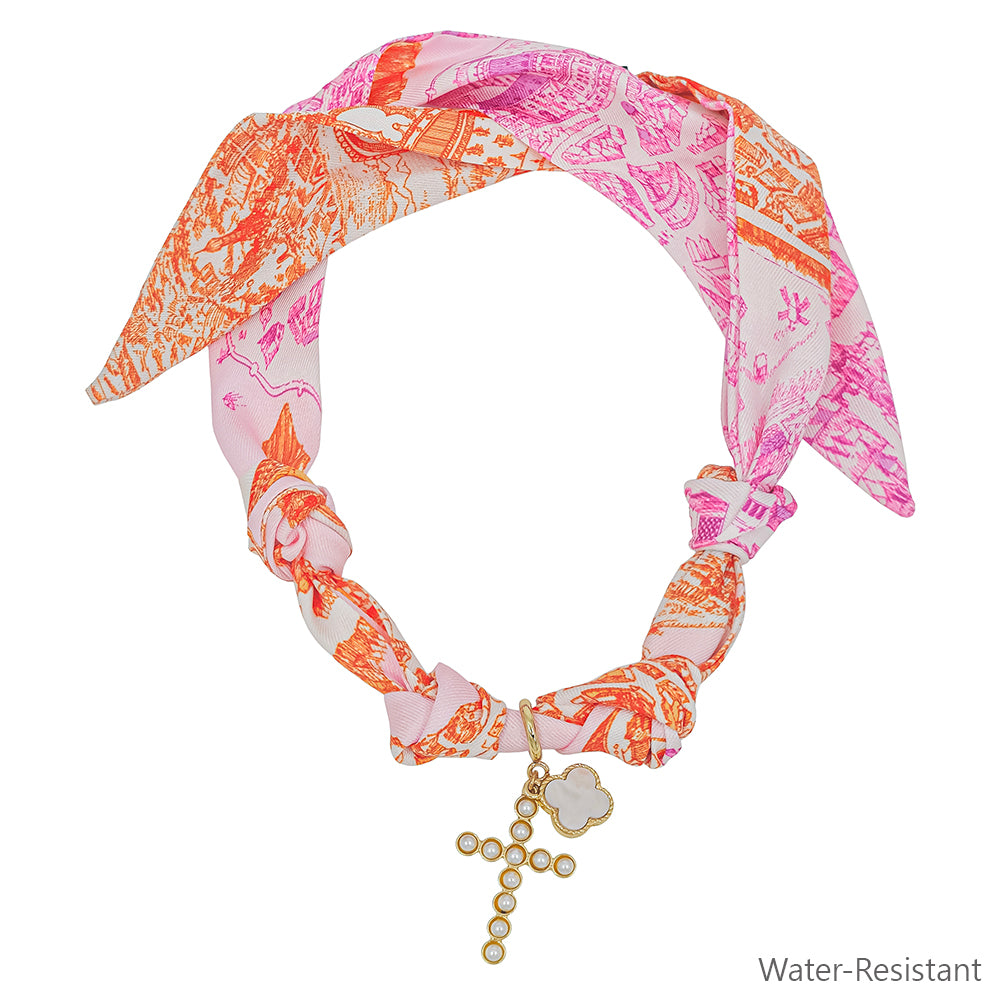 Pink and Orange Scarf Necklace with Cross and Pearlized Clover Charm