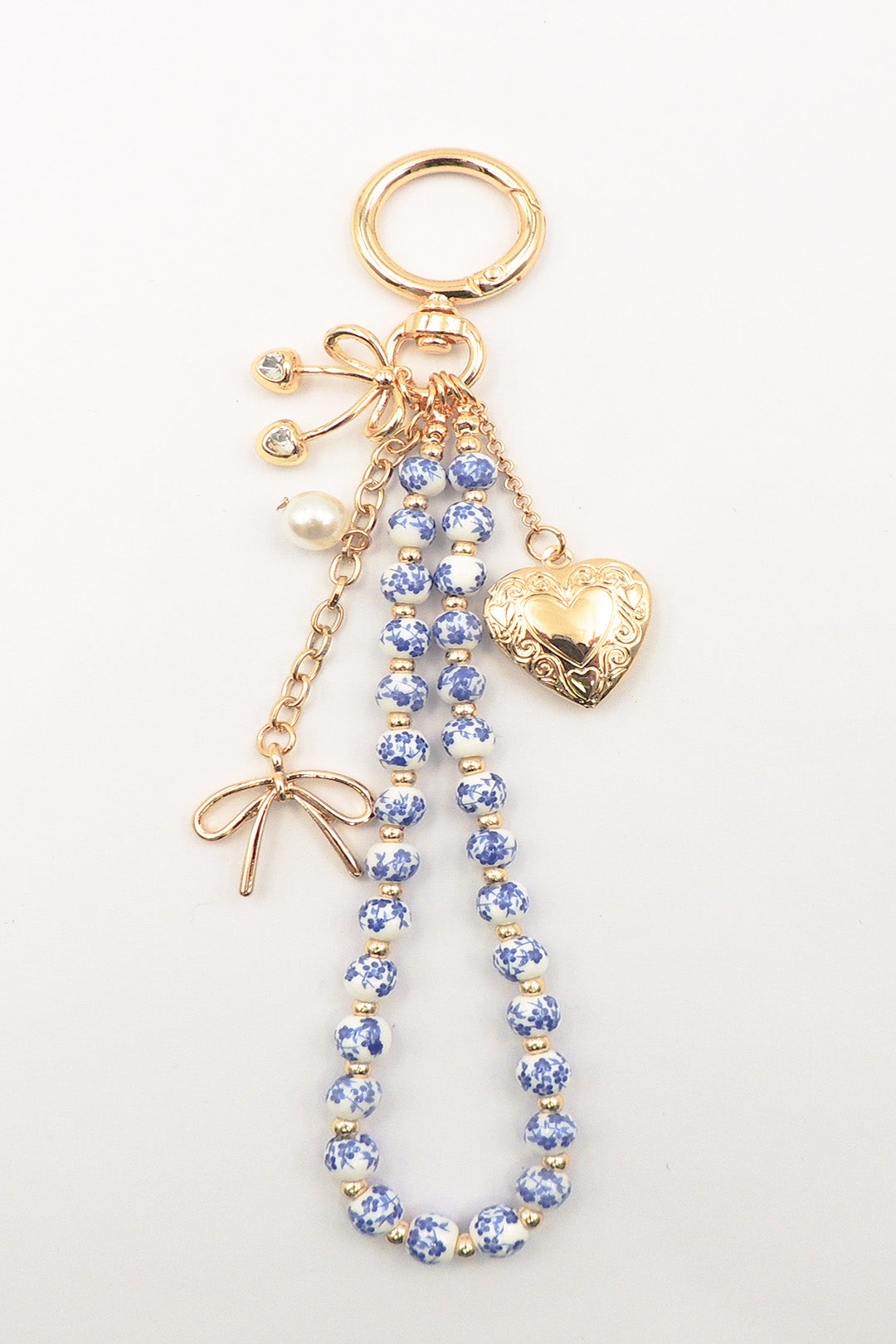 Purse Charm- Bow, Heart, Cherrys with Blue and White Ceramic Beaded Chain. Very Popular
