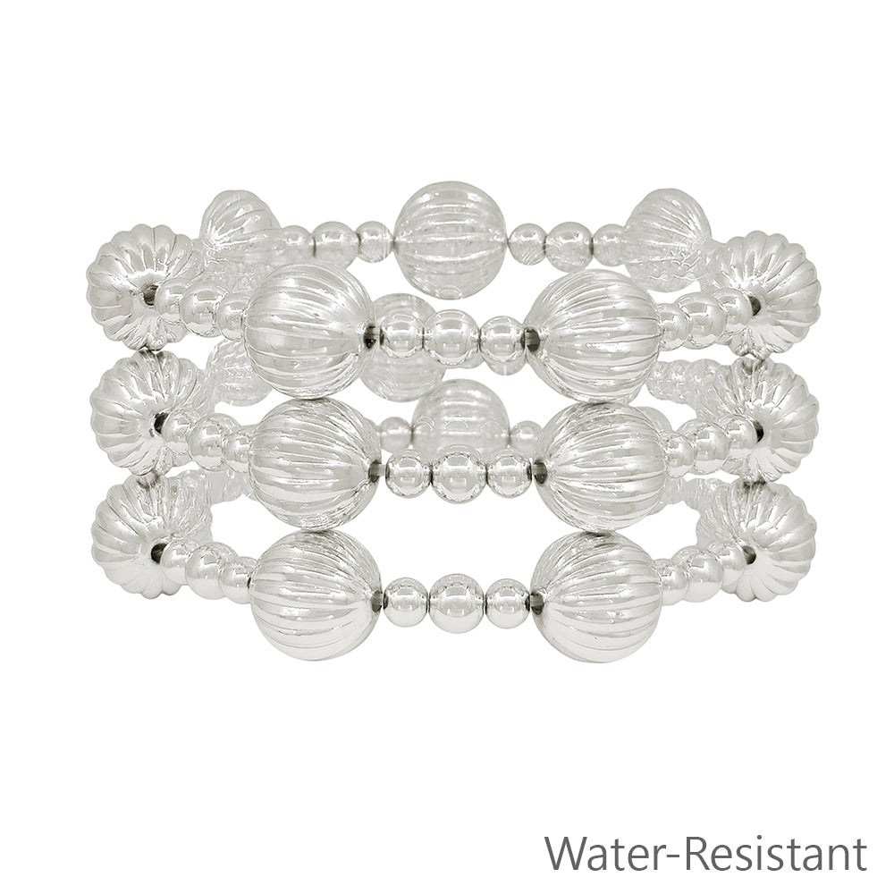 Water Resistant Set of 3 Silver Beaded with 14MM Textured Beaded Bracelet Set