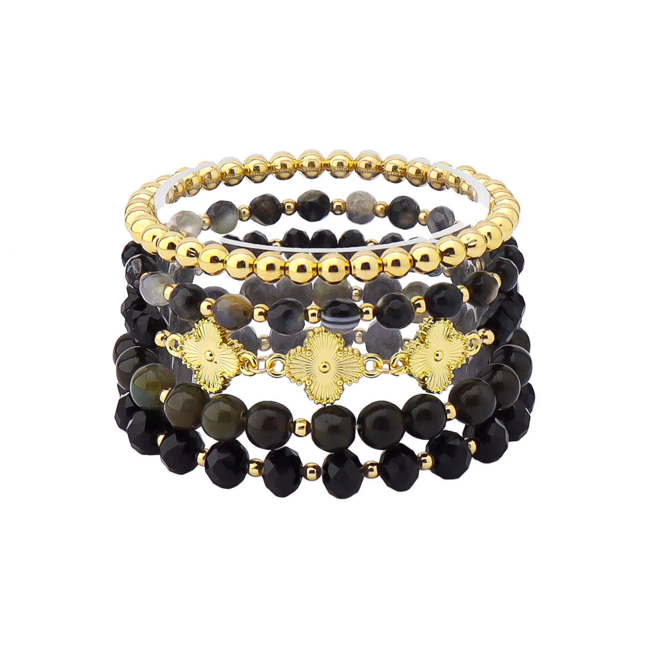 Set of 5 Gold, Black Natural Stone, and Gold Clover Stretch Bracelet Set