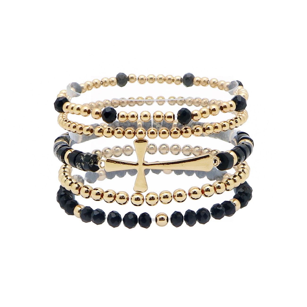 Set of 5 Gold, Black Crystal, and Gold Cross Stretch Bracelet Set
