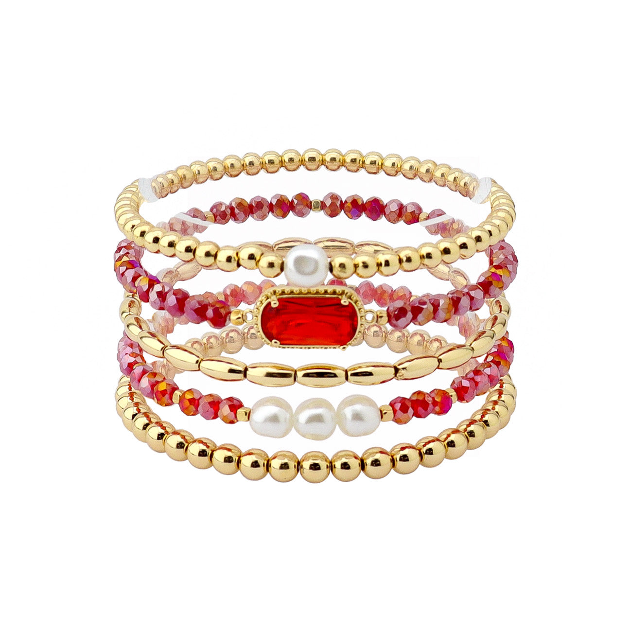 Set of 5 Red Crystal, Pearl, and Gold Stretch Bracelets