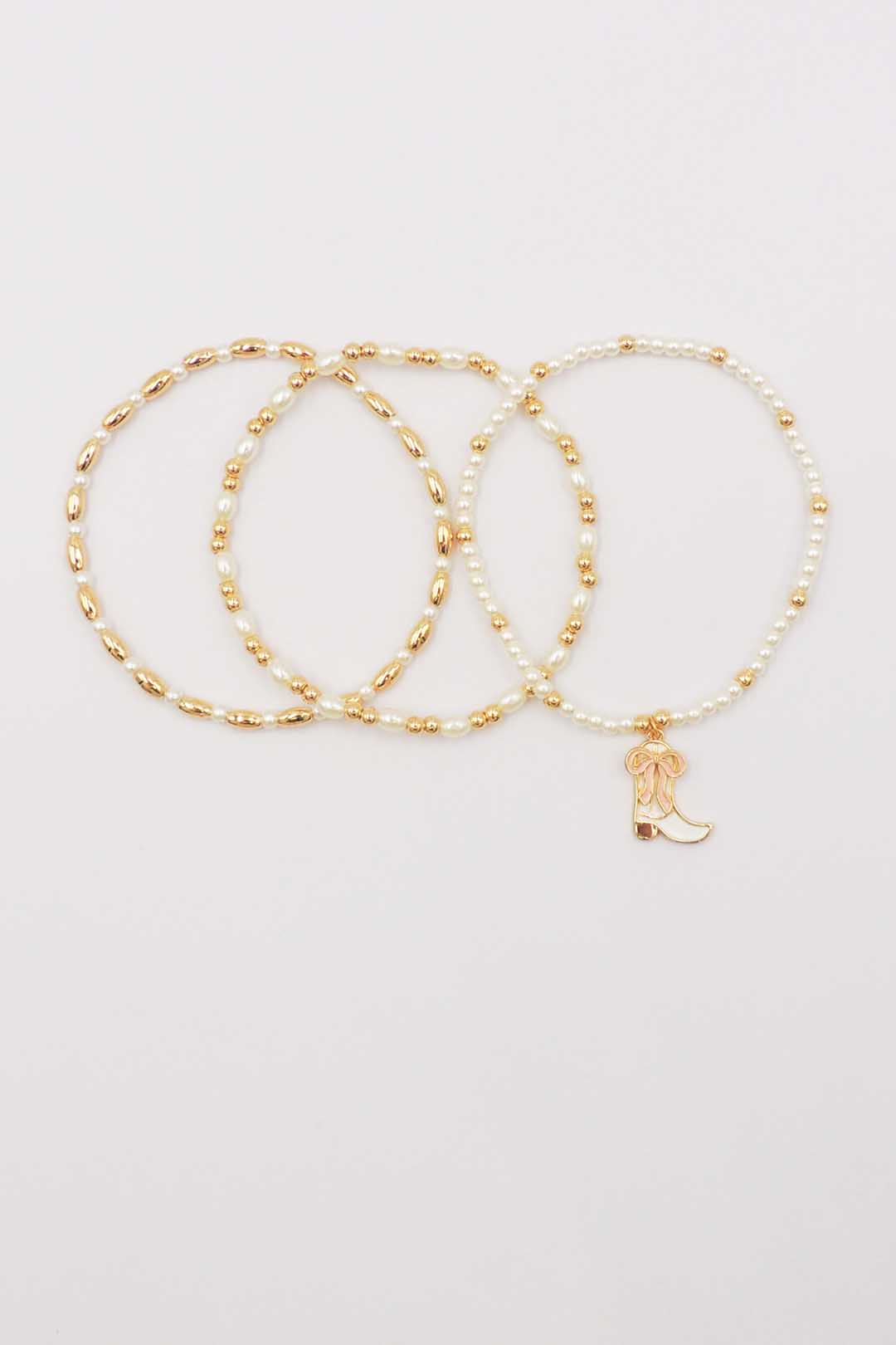 Set of Three Gold and Pearl Stretch Bracelets with Light Pink Bow on White Cowboy Boot Charm