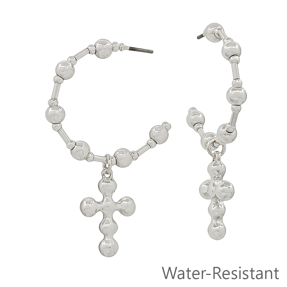 Silver Beaded Hoop with Cross Drop 1.25" Earring