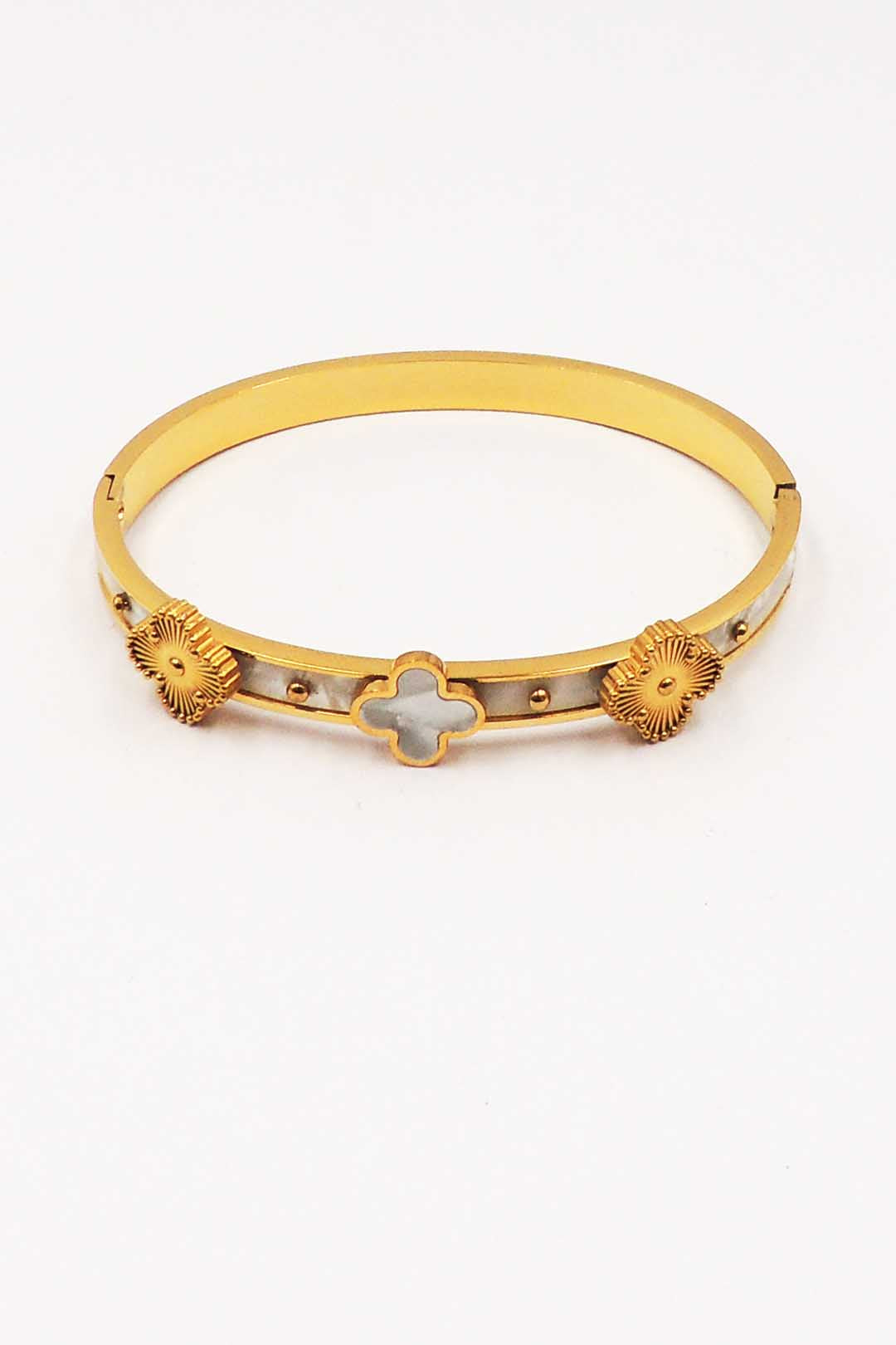 Stainless Steel Gold and Pearlized Clover Hinged Bangle