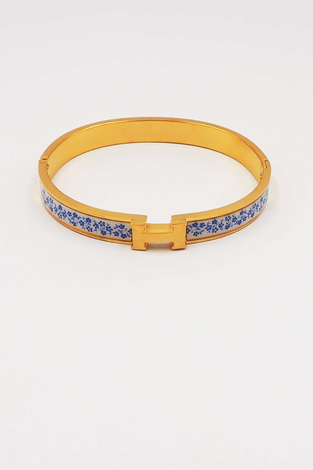 H Stainless Steel Hinged Bangle with Blue and White Details Bracelet