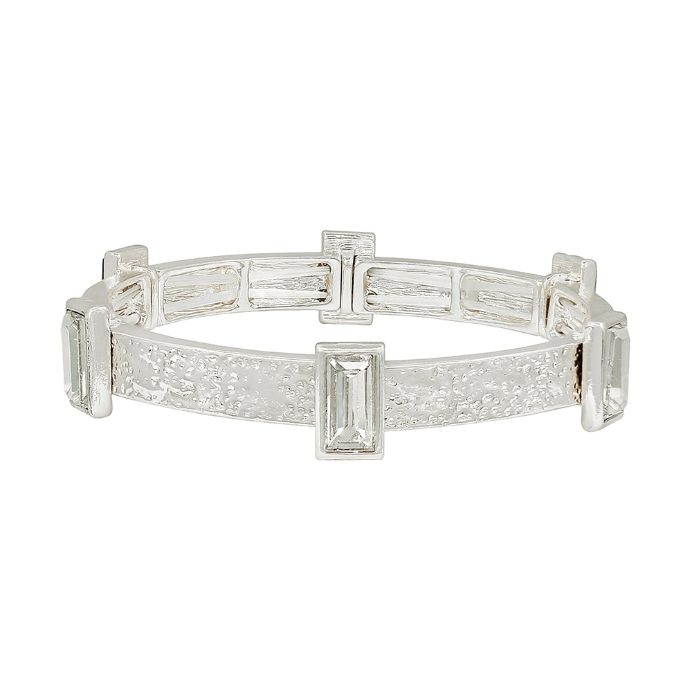 Textured Silver with Clear Rectangle Crystals Stretch Bracelet