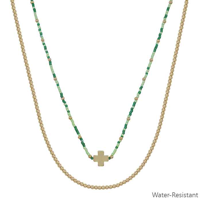 Water Resistant Green Seed Bead with Gold Cross 16"-18" Necklace