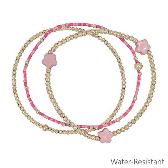 Water Resistant Set of 3 Gold Beaded, Pink Seed Bead and Flower Stretch Bracelets