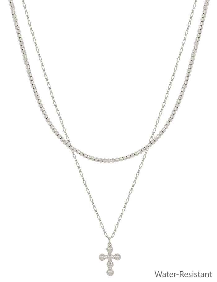 Water Resistant Silver 2mm Beaded Chain with Beaded Cross Layered 16"-18" Necklace