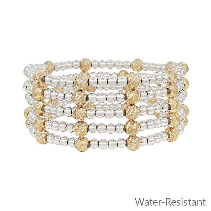 Water Resistant Silver and Gold Textured Beaded Set of 5 Stretch Bracelets
