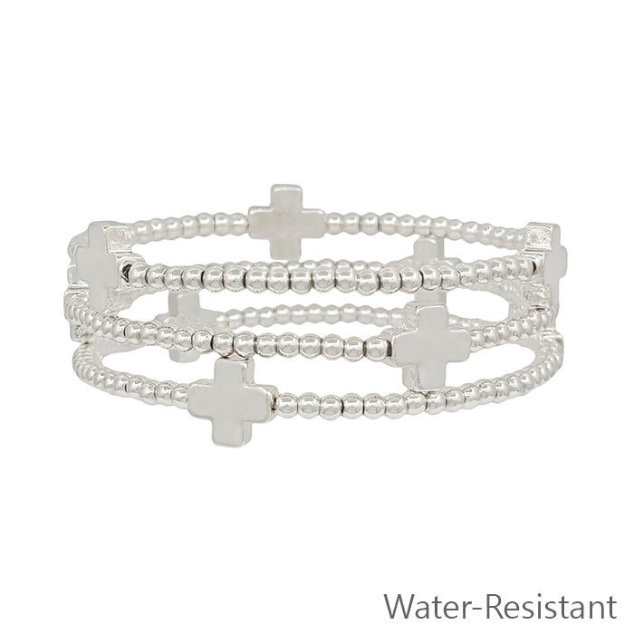 Water Resistant Silver Set of 3 3mm Beaded with Cross Stretch Bracelets