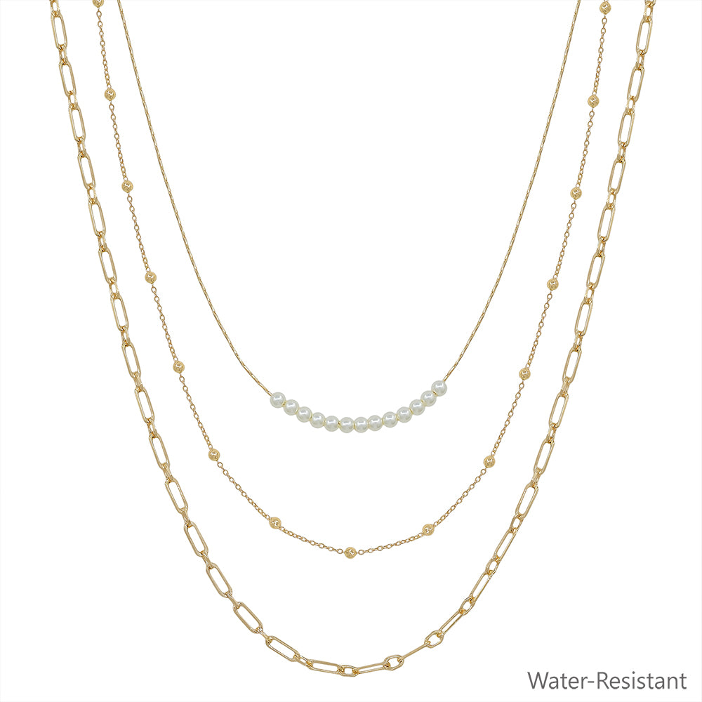 Water Resistant Triple Layered Gold with Pearl Thin Dotted Chain 16"-18" Necklace