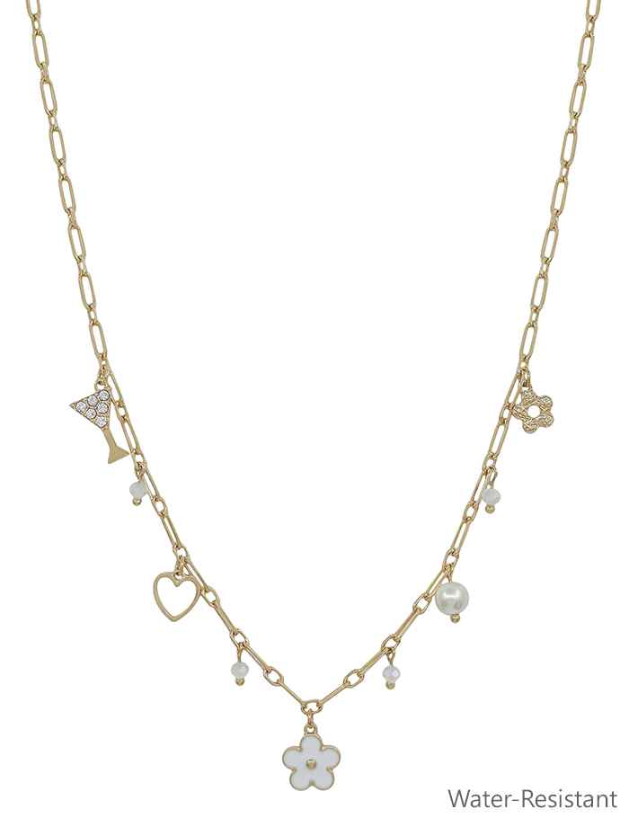Water Resistant White Flower, Heart, Pearl Charm 16"-18" Necklace