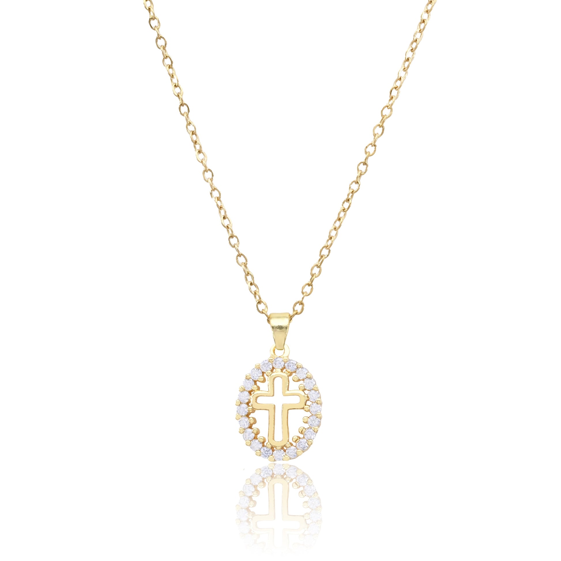 Waterproof Stainless-Steel Gold Chain with Rhinestone Circle and Cross 16"-18" Necklace