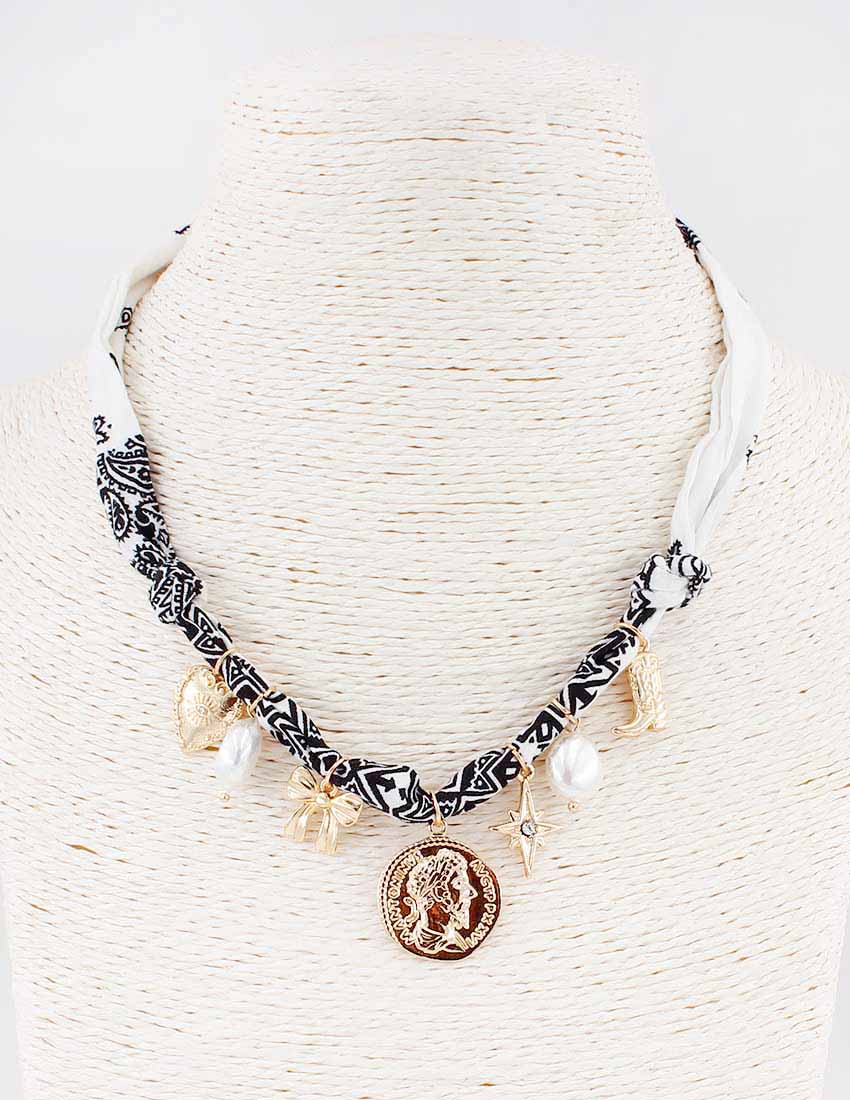 White and Black Knotted Scarf Necklace with Coin, Bow, and Pearl Charms